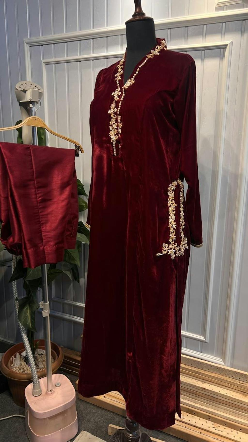 Exquisitely hand-embellished with intricate Gold copper-toned zari thread and Swarovski crystal work adorning the neckline and sleeves. Crafted from premium velvet with elegant Parsi-inspired cuts on emerald green color, this dress adds a glamorous touch to your winter wardrobe. This majestic velvet piece is uniquely designed for elegant personality.