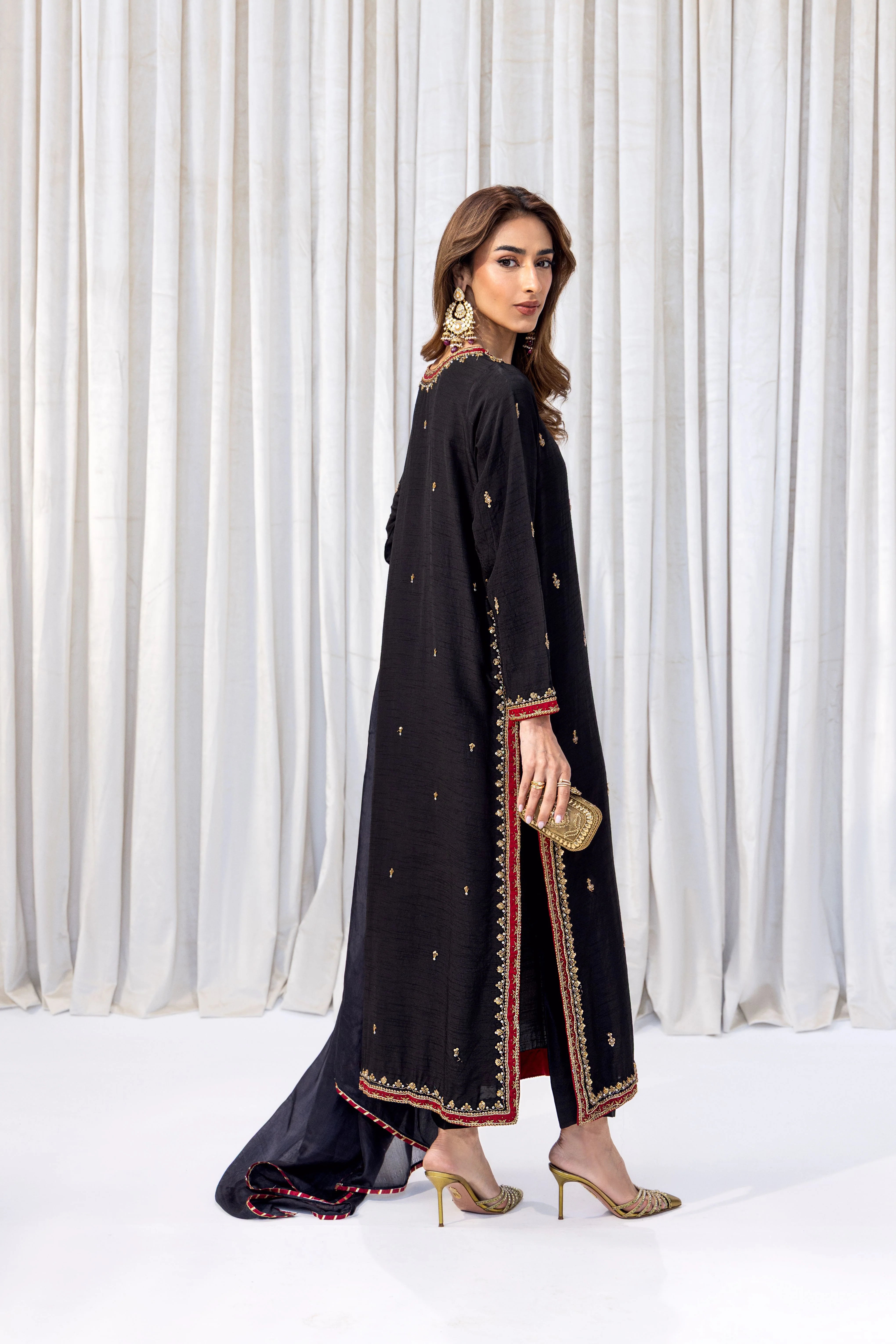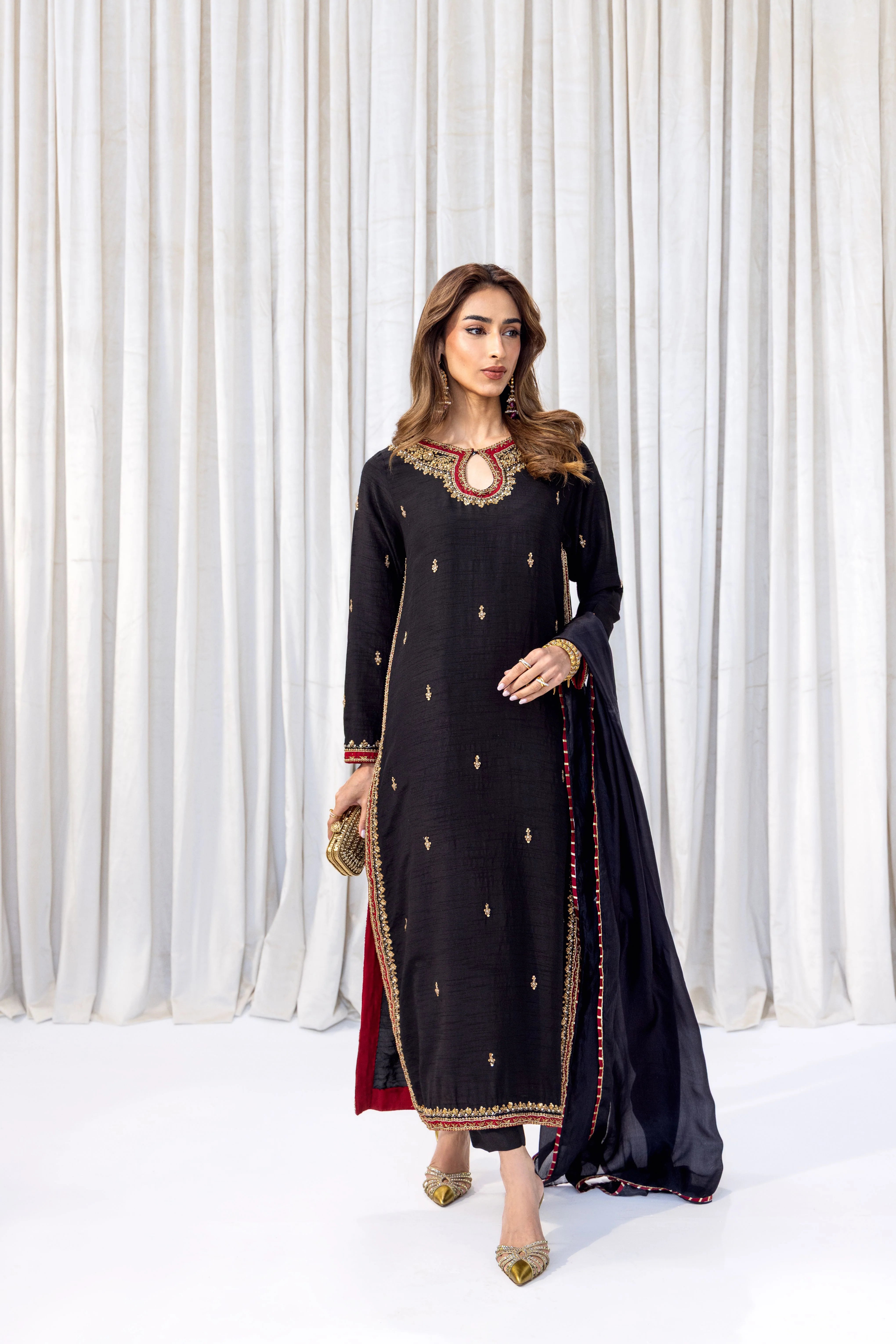 A timeless black ensemble enriched with exquisite gold handwork. The long, straight-cut shirt is adorned with finely crafted hand-embroidered motifs scattered across the fabric, exuding understated luxury. A striking neckline, detailed with intricate gold and red handwork, adds depth and opulence to the design. Styled with tailored trousers and a perfectly coordinated dupatta.