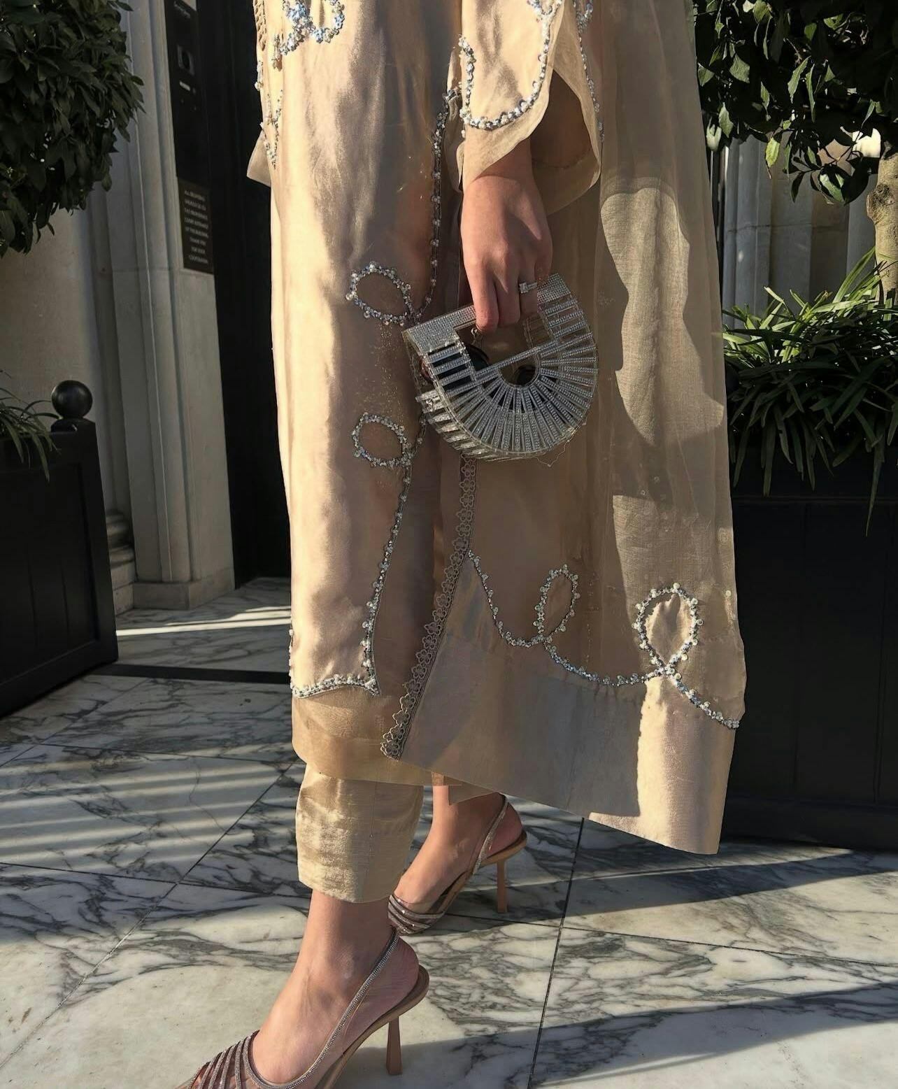 This long-length shirt in a beautiful light gold beige color is crafted from pure sheesha silk, showcasing intricate Swarovski and aari hand embellishment along the neckline and hem. The Swarovski and Pearl embellishments are delicately enhanced with soft beige resham silk thread accents. The ensemble is completed with an organza dupatta featuring exquisite chatta patti details and a graceful lace trim. For a polished look, the shirt is ideally paired with a pure sheesha silk pants