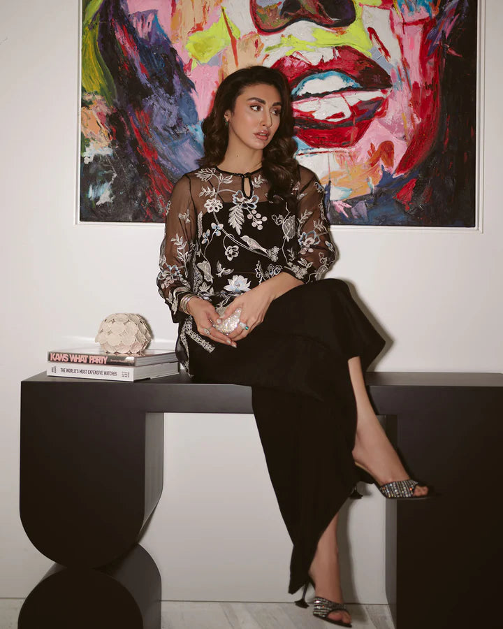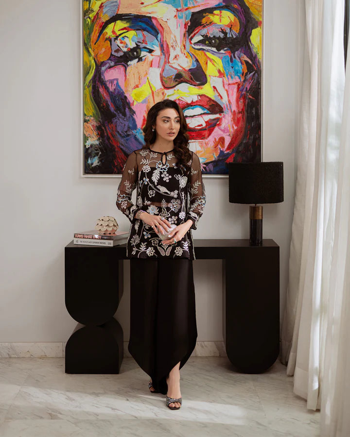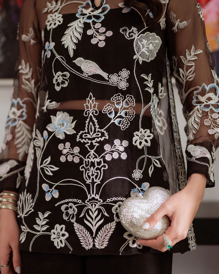 This black organza shirt is meticulously tailored, with an intricately hand-embroidered neckline that embodies delicate finesse. Styled with raw silk petal-legged pants, the ensemble exudes effortless elegance. The artistry of the craftsmanship is simply breathtaking.